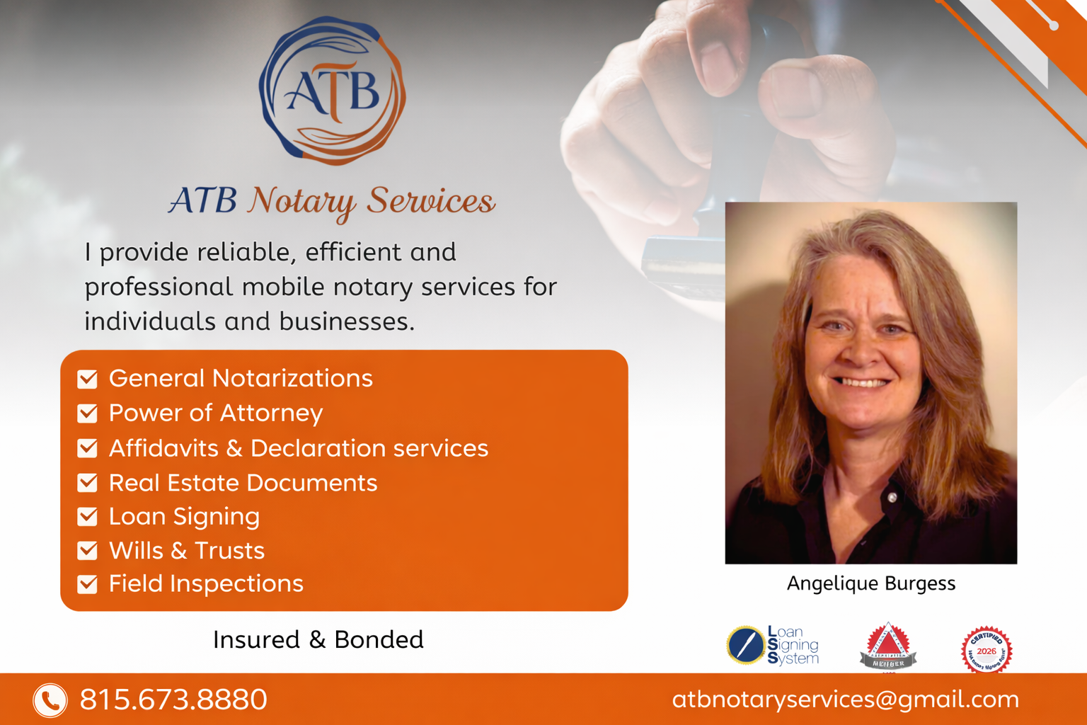 Welcome to ATB Notary Services! I’m Angelique Burgess, a certified notary public and loan signing agent serving La Salle County, Illinois and the surrounding areas.